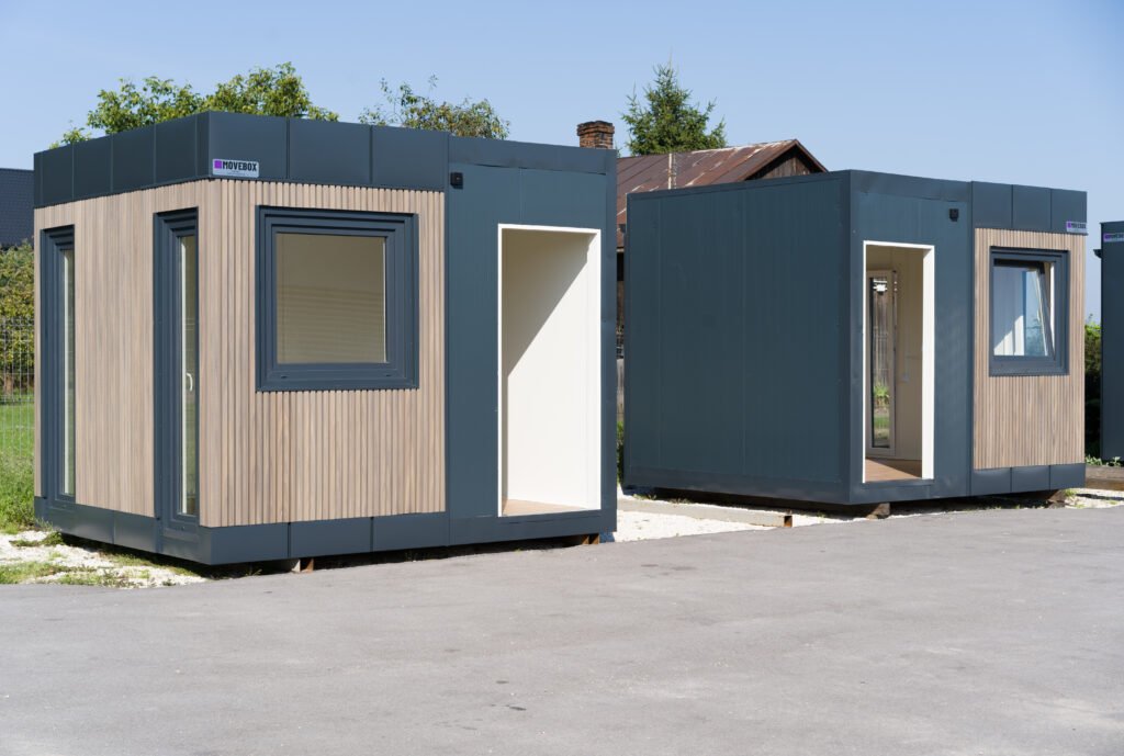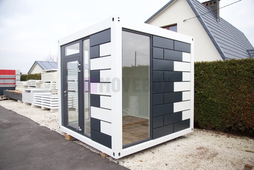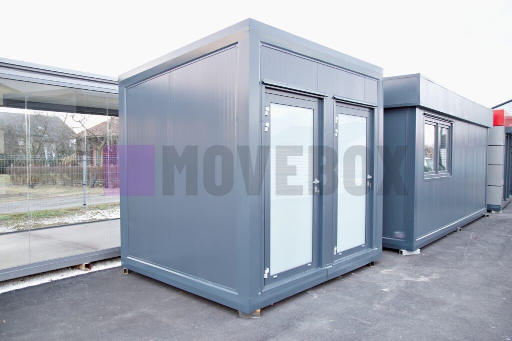 Neue MOVEBOX-Container mit den Abmessungen 8,00 m x 3,00 m und 3,00 m x 2,00 m mit C-Rahmen und einer Außenhöhe von 3,00 m (Flachdach, Transportösen, stapelbar, Möglichkeit zum Bau einer Dachterrasse).