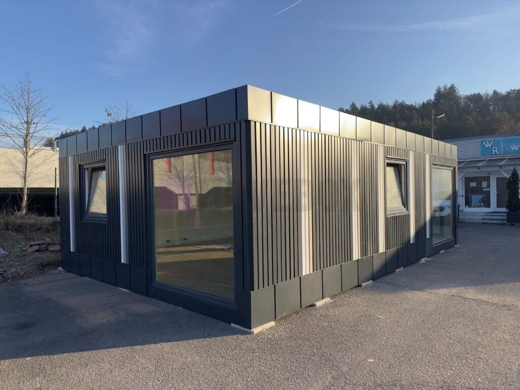 (im Preis inbegriffen) Typ C. Stahlrahmen von außen sichtbar (Transportösen, ähnlich wie bei einem Seecontainer, stapelbar, Dachterrasse möglich). Rahmenfarbe: RAL7016